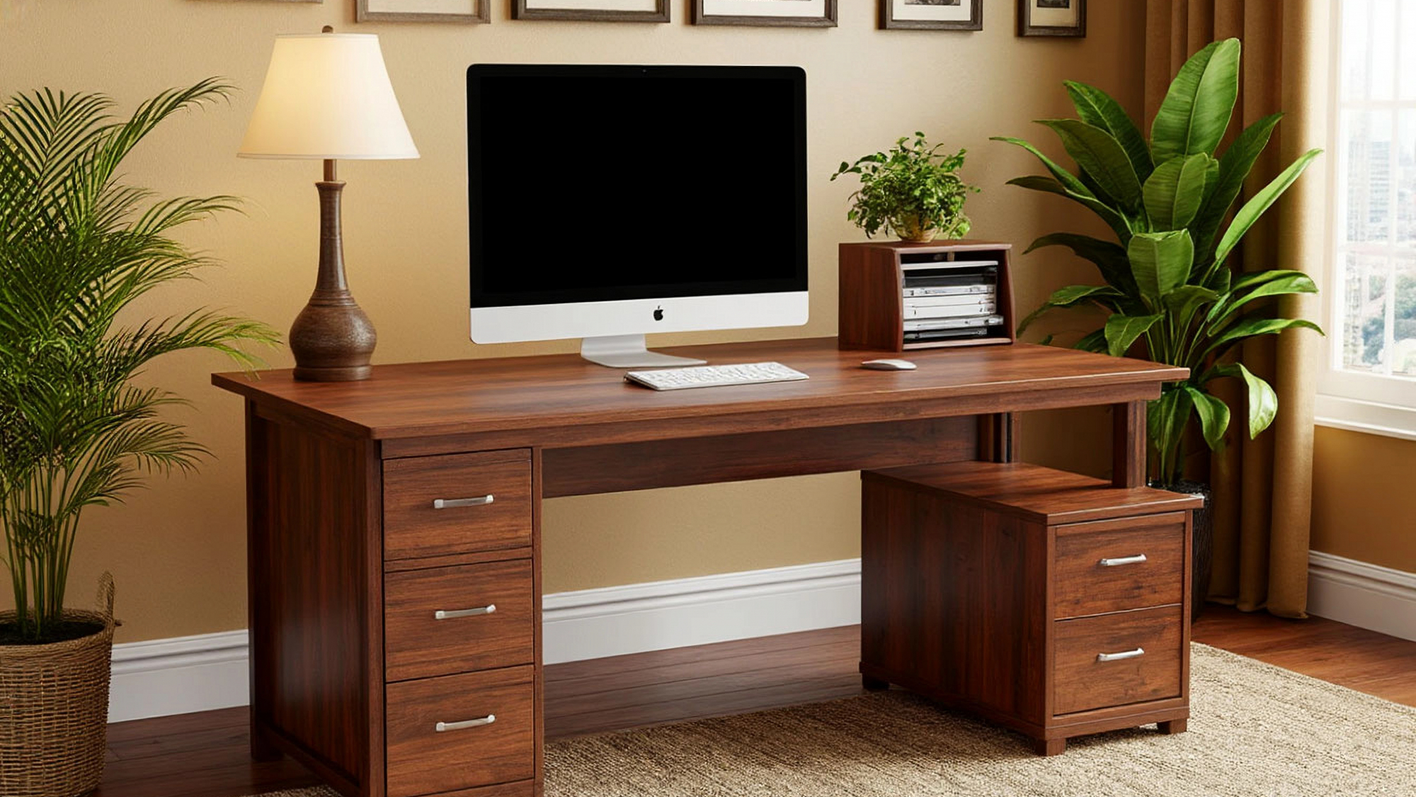 Металлические элементы в конструкции стола придают ему современный и стильный вид. Эти элементы не только увеличивают прочность конструкции, но и добавляют эстетическую привлекательность. Они гармонично сочетаются с теплым оттенком ореха, создавая атмосферу уюта и профессионализма. Такой стол станет отличным акцентом в любом интерьере, будь то домашний кабинет или офисное пространство. Он способен стать центром вашего рабочего пространства, вокруг которого будет удобно организовать остальные элементы мебели.