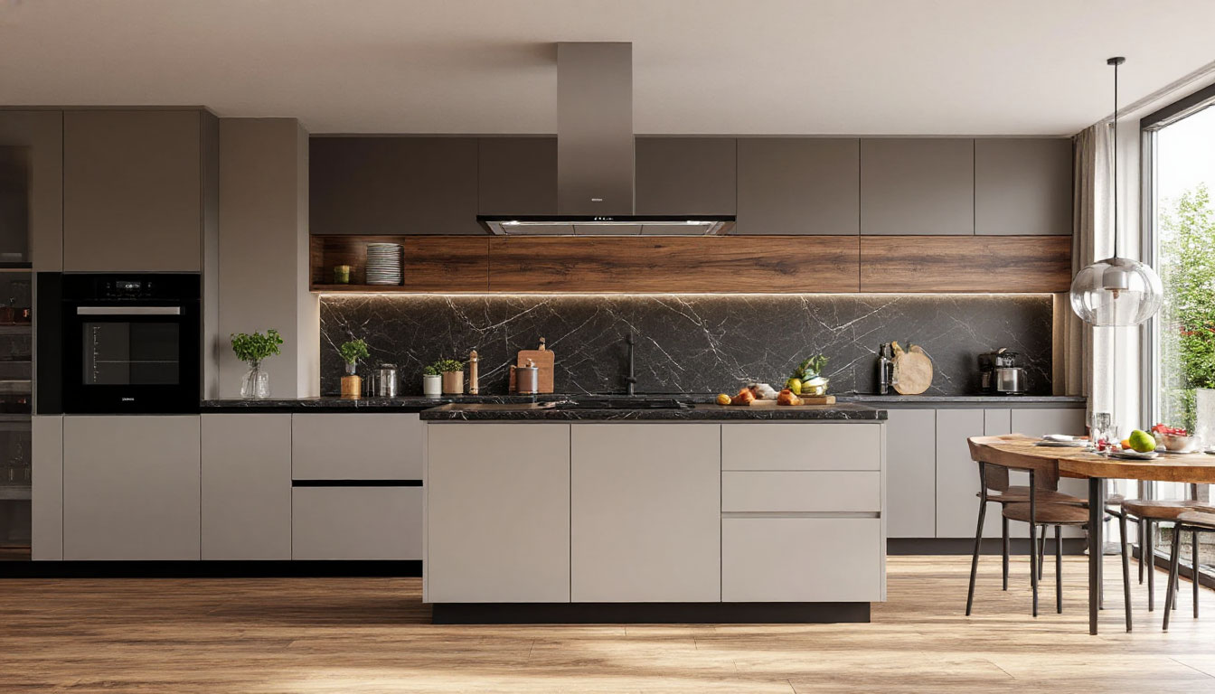 Темное дерево, использованное в отделке, придает интерьеру дополнительную теплоту и уют. Его текстура прекрасно контрастирует с гладкими серыми фасадами, создавая интересные визуальные акценты и добавляя глубину в общее восприятие пространства. Каждая деталь продумана до мелочей: ручки из матового металла гармонично сочетаются с древесными элементами, создавая единую композицию, которая радует глаз.
