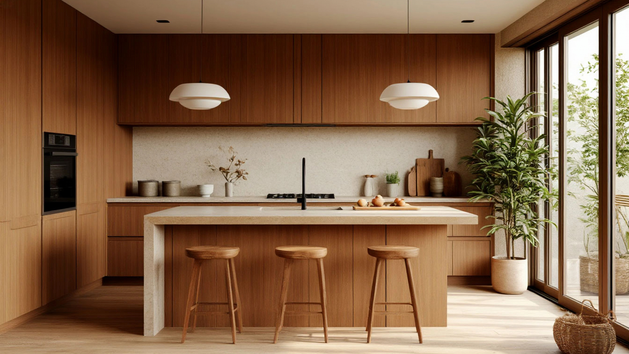 Особую роль в восприятии кухни играет текстура. Фасады под орех имеют мягкий природный рисунок, который не спорит с остальными элементами интерьера, а словно поддерживает общий ритм. Светлая столешница с нежным матовым эффектом добавляет лёгкости и делает поверхность визуально более широкой. Материал имитирует природный камень, но выглядит легче и теплее, что идеально подходит для джапанди — здесь важно ощущение тактильной мягкости и естественности.