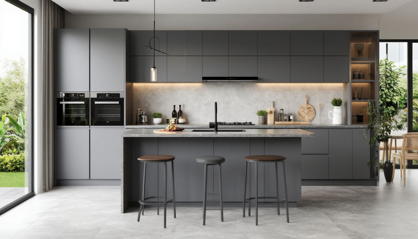 Серые оттенки, варьирующиеся от светлых, почти серебристых до глубоких антрацитовых, позволяют легко интегрировать кухню в любое пространство и гармонично сочетать её с различными элементами декора и бытовой техникой. Гладкие поверхности фасадов отражают свет, придавая пространству визуальную лёгкость и открытость. В то же время матовые текстуры добавляют глубину и изысканность, создавая интересные контрасты и акценты. Такой цветовой выбор не только современен, но и универсален — он легко вписывается в различные стилистические направления, от минимализма до скандинавского дизайна.