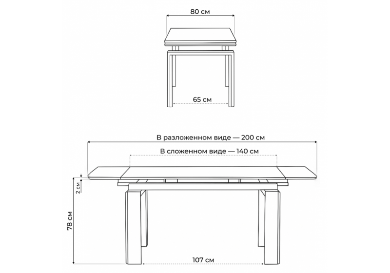 Расстояние между ножками: 107 х 65 см. Толщина столешницы: 2,2 см.