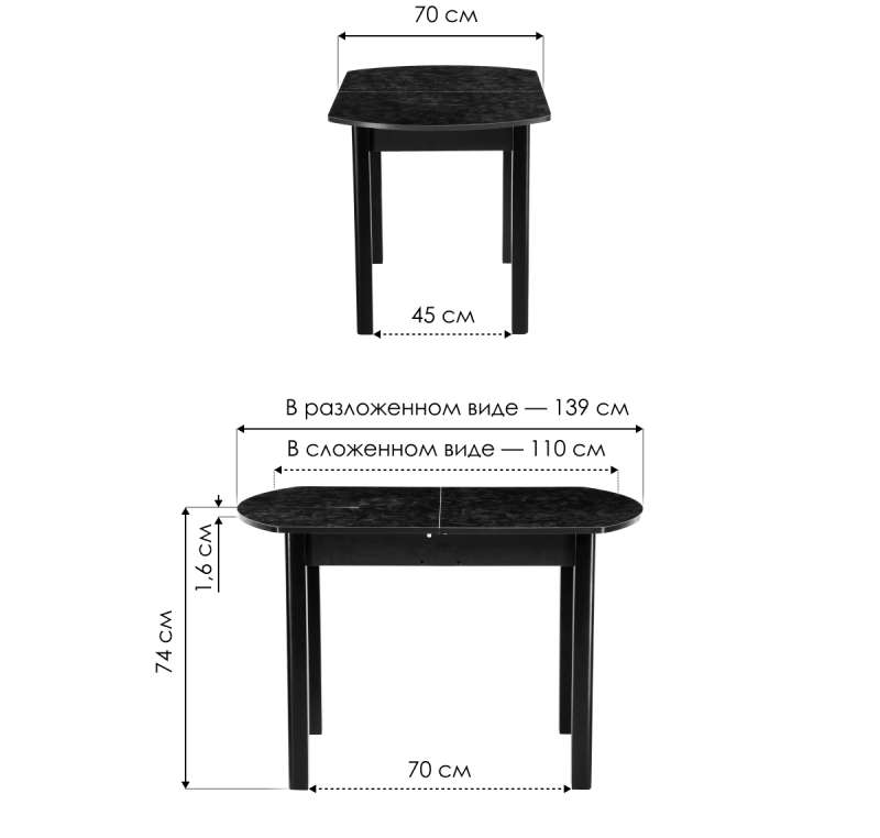 Расстояние между ножками: 70 х 45 см. Толщина столешницы: 1,6 см.