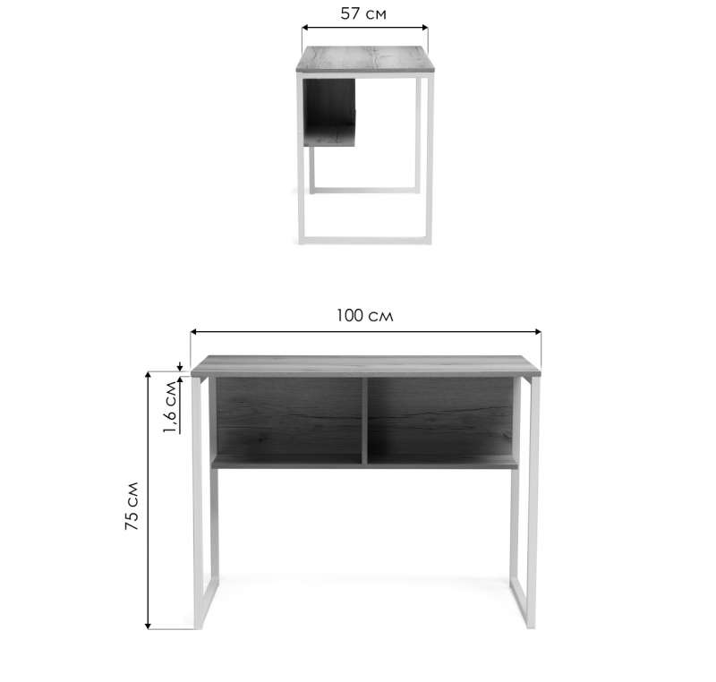 Расстояние между ножек: 94,5 см. Высота до полки: 42 см. Размер одной полки (Ш х Г х В): 46,5 х 22 х 30. Толщина столешницы: 1,6 см.