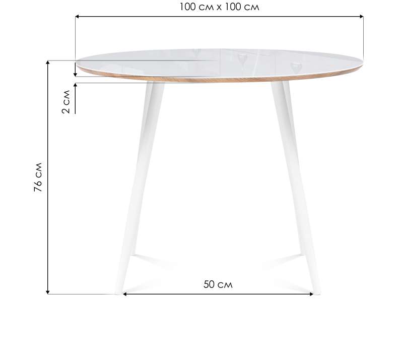 Расстояние между ножками: 50 х 50 см. Толщина столешницы: 2 см. Толщина МДФ под стеклом: 1,6 см. Толщина стекла: 0,4 см.