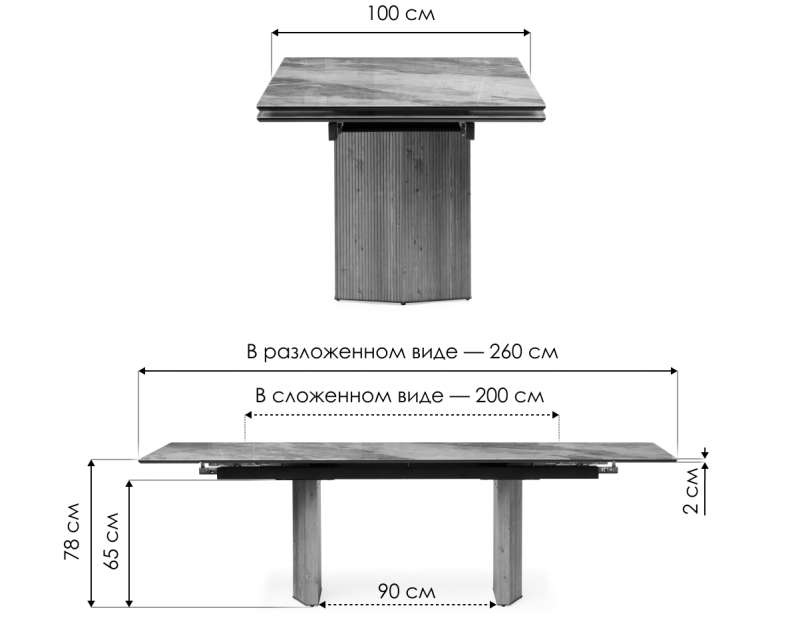 Расстояние между ножками: 90 см. Толщина столешницы: 2 см.