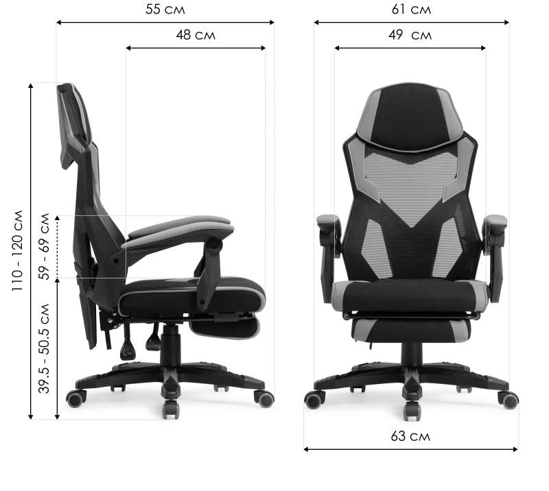 Высота подлокотников: 59 - 69 см. Высота спинки: 70 см. Диаметр крестовины: 63 см.