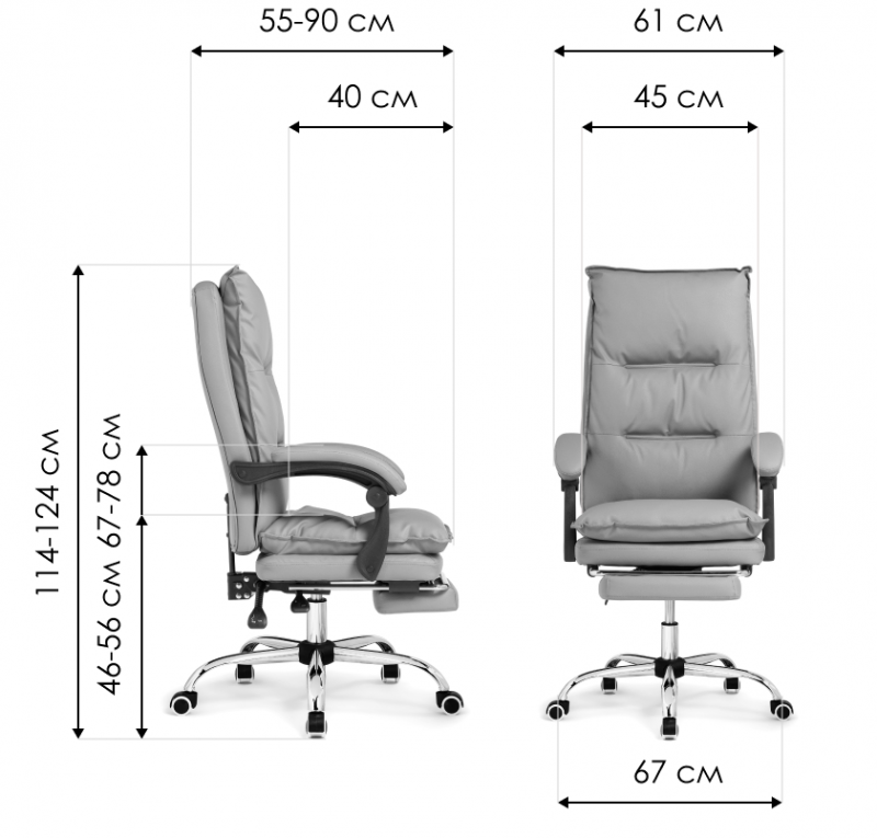 Высота подлокотников: 67 - 78 см. Диаметр крестовины: 67 см.