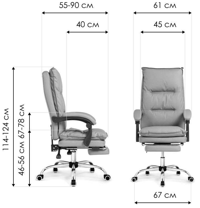 Высота подлокотников: 67 - 78 см. Диаметр крестовины: 67 см.