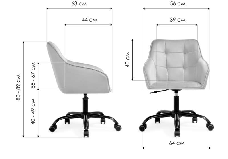 Высота подлокотников: 58 - 67 см Диаметр крестовины: 64 см